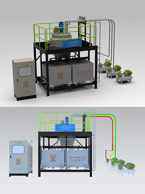 2.乳化秤304不锈钢材质,500L-1000L,带乳化、搅拌、自动控温功能。上下结构,上部为乳化罐,下部为双缓存称重斗。乳化罐电加热棒导热油加热。